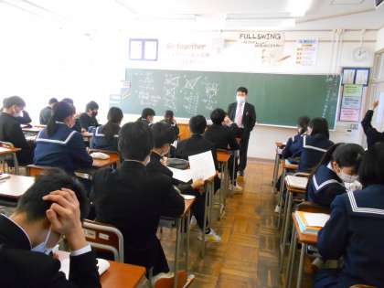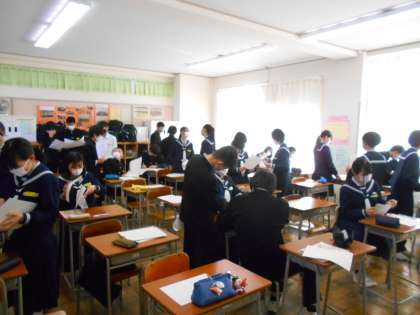 2年・授業風景 公開日 2023/02/27 更新日 2023/02/27 2学年 2月27日(月) 4限 数学では、定期考査の答案が返却されました。 「今回のテスト頑張ったよ!」と声が聞こえます。 (写真 上:2年2組) 技術は、コンピューター室での授業です。 真剣に先生の話を聞いています。 (写真 中:2年3組) 英語では、定期考査の答案が返却されました。 「ここはどう書いた?」友達同士、話し合っています。 (写真 下:2年4組)