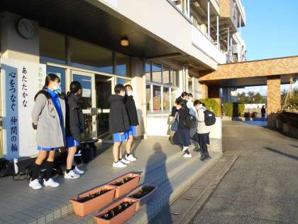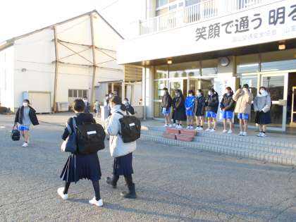 お助け下校完了隊 公開日 2023/02/27 更新日 2023/02/27 山室中学校のページ 2月27日(月) 17:00 本日のお助け下校完了隊は、女子バドミントン部です。 「下校しましょう!」と元気よく声を掛けています。
