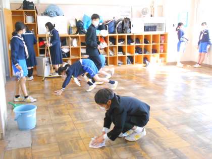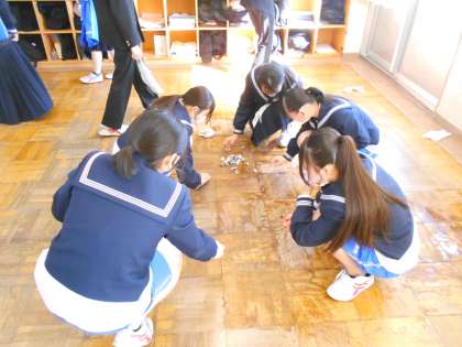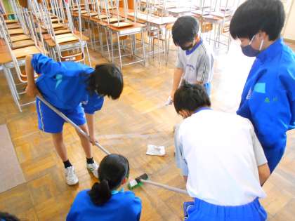 ワックスがけ・その1 公開日 2023/03/03 更新日 2023/03/03 山室中学校のページ 3月3日(金) 15:00 全学年で、放課後ワックスがけを行いました。 まずは、1年間お世話になった教室や廊下を雑巾やスポンジを使って、しっかりと磨き上げています。 (写真 上:1年 中:2年 下:3年)