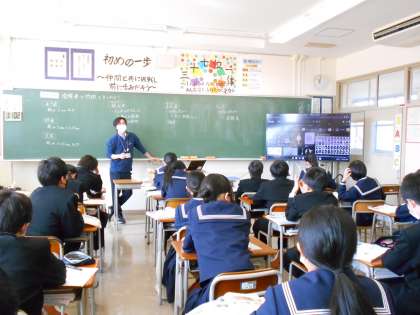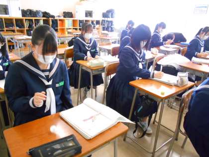 1年・授業風景 公開日 2023/03/07 更新日 2023/03/07 1学年 3月7日(火) 3限 数学では、ペットボトルのキャップを振って、裏、表、横になる確率を試しています。 (写真 上:1年1組) 理科では、堆積岩の特徴をノートにまとめています。 (写真 中:1年2組) 社会では、東南アジアの貿易と南蛮人について学んでいます。 (写真 下:1年4組)