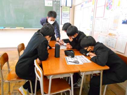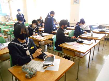 2年・授業風景 公開日 2023/03/07 更新日 2023/03/07 2学年 3月7日(火) 3限 英語では、新出単語をリピートしています。 (写真 上:2年1組) 道徳では、各グループで課題解決の話し合いをしています。 (写真 中:2年2組) 美術では、ガラスアートがいよいよ完成して額に作品を入れています。 (写真 下:2年3組)