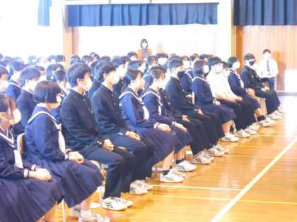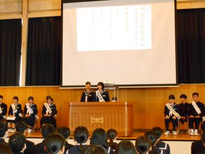 前期生徒会役員選挙・その1 公開日 2023/03/08 更新日 2023/03/08 生徒会活動 3月8日(水) 5、6限 前期生徒会役員選挙・立会演説会を体育館で行いました。 生徒会長、副会長、各学年代表の候補者と応援弁士が壇上で熱い演説を繰り広げました。 演説を聴く生徒も、しっかりと顔をあげ、各候補者の公約を受け止めました。