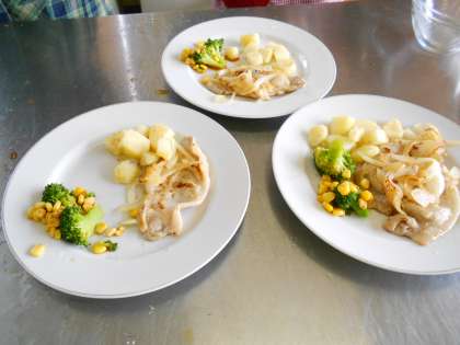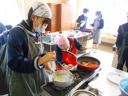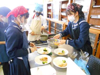 1年・家庭科・調理実習 公開日 2023/03/09 更新日 2023/03/09 1学年 3月9日(木) 6限 1年5組の家庭科は、「五感が喜ぶ肉料理」の調理実習をしました。 肉料理は、塩麹、ポークチャップ、しょうが焼きから各班で選びます。 焦がさないように火加減に細心の注意を払ったり、ブロッコリーの彩りをよくするためにゆで時間や塩を入れたりと五感が喜ぶ工夫がいっぱいの調理実習になりました。