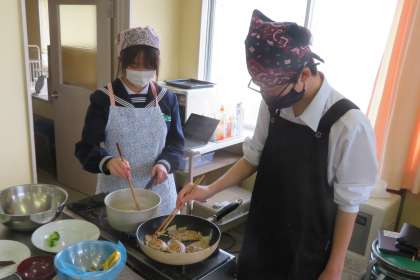 1年5組の家庭科は、「五感が喜ぶ肉料理」の調理実習をしました。