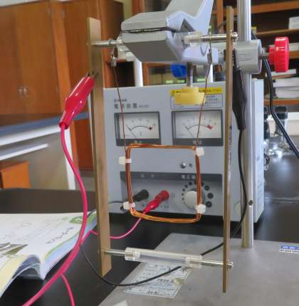 2年3組の理科は、「磁界の中で電流を流したコイルのようす」を調べる実験を行いました。