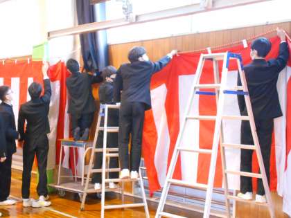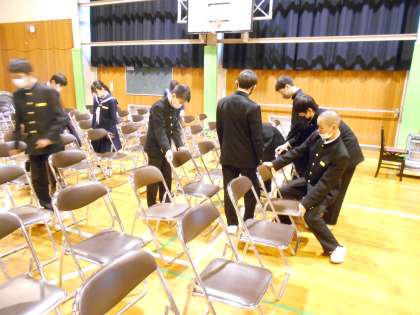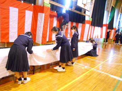 2年生は、明日の同窓会入会式と明後日の卒業証書授与式に向けて、会場準備をしています。