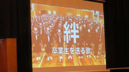 また、「卒業生を送る歌」は、先日、1,2年生全員で収録した「絆」のビデオを上映しました。(写真:下)