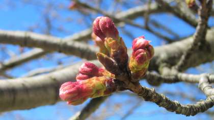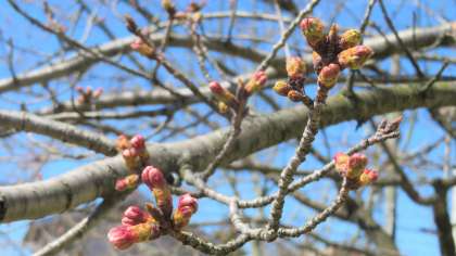 うららかな春の陽気に誘われ、山室桜の花芽もピンク色が増してきました。