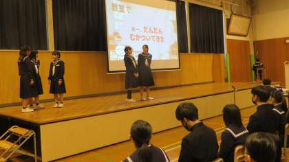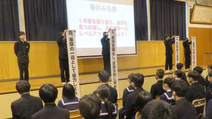 生徒集会・その1 公開日 2023/03/23 更新日 2023/03/23 山室中学校のページ 3月23日(木) 5限 体育館で生徒集会を行いました。 (写真 上:春休みの目標) (写真 中:先輩からの手紙) (写真 下:春休みの注意点・寸劇「なりすまし」) 生徒会執行部を中心に、「春休みの生活について」について、4つの目標を発表したり、先輩からの手紙を紹介したり、「なりすまし」の寸劇を発表したり、……