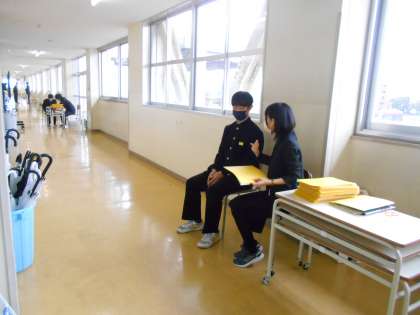 2年・最後の学活 公開日 2023/03/24 更新日 2023/03/24 2学年 3月24日(金) 3限 2年生は、廊下で担任から通知表を受け取っています。 1年間の頑張った点等を笑顔で話しています。 (写真 上:2年2組 中:2年3組 下:2年4組)
