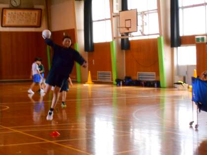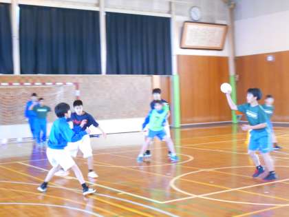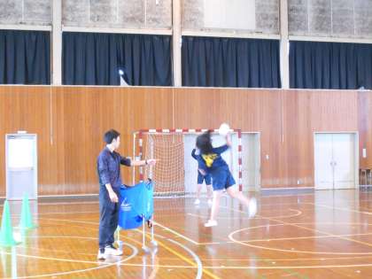 第1体育館では、男女ハンドボール部がシュート練習をしています。