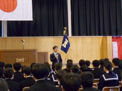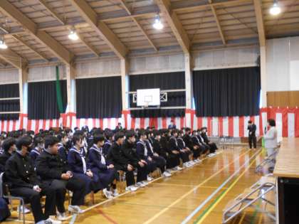 4月7日(金) 1限 2年生になって初めての学年集会です。 学年の先生の顔をしっかりと見ながら、話を聞いています。