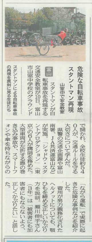 昨日10日(月)5限の「スタントマンによる交通安全教室」のようすが新聞で紹介されました。