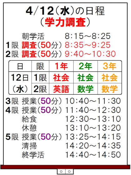 明日、2,3年生は「県中教研学力調査・2日目」が、1年生は「市学力調査・2日目」です。(日程は下記のとおりです。)