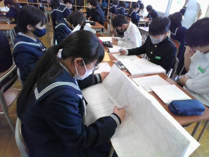 地図記号の問題に挑戦。班で大きな地図を広げて、協力しながら、問題を解いていました。