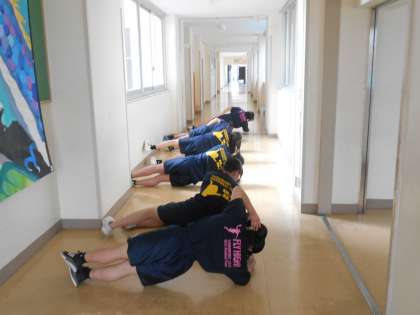 体育館前廊下では、女子ハンドボール部が練習試合に備えて、スタンバイをしています。(写真:下)