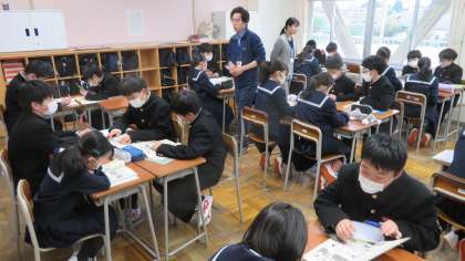 1年・授業風景 公開日 2023/04/18 更新日 2023/04/18 1学年 4月18日(火) 1限 少し肌寒いようにも感じますが、学習するには集中できる環境です。 (写真 上:1年1組 英語「アルファベット」) (写真 中:1年2組 数学「正負の数」) (写真 下:1年4組 理科「理科室の使い方」)