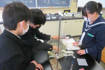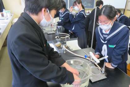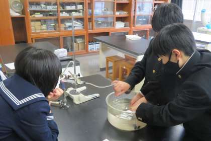 2年・理科・炭酸水素ナトリウムの熱分解 公開日 2023/04/18 更新日 2023/04/18 2学年 4月18日(火) 1限 2年2組の理科は、第2理科室で、炭酸水素ナトリウムの熱分解の実験をしていました。 どの班も、加熱することで出てくる気体を上手に上方置換法で集めていました。(写真)