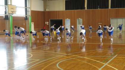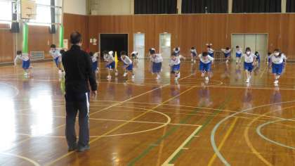 1年4組の体育は、第1体育館で、クラウチングスタートの練習をしていました。