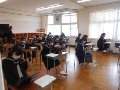 3年・全国学力学習状況調査 公開日 2023/04/25 更新日 2023/04/25 3学年 4月25日(火) 5限 3年生は、午後から、全国学力学習状況調査の英語の調査を受けました。 クロムブックを使って、話すこと、聞くことについて真剣に回答をしています。