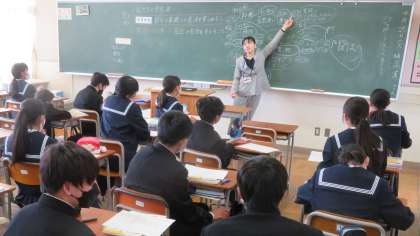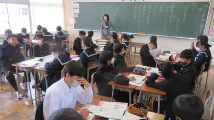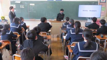 (写真 下:1年5組 英語「英語で自己紹介」)
