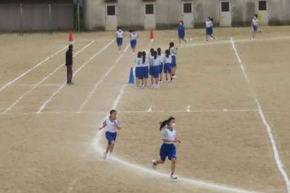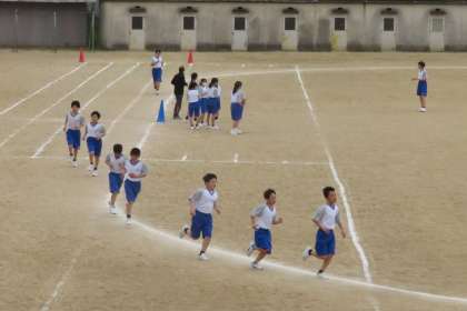 1年4組の体育は、グラウンドで、長距離走をしていました。
