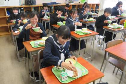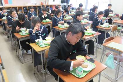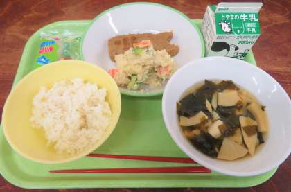 「こどもの日」給食 公開日 2023/04/26 更新日 2023/04/26 山室中学校のページ 4月26日(水) 給食 今日の給食は、「こどもの日」メニューです。 献立は、「ごはん、牛乳、鯉のぼりハンバーグ、若竹汁、ごまポテトサラダ、かしわもち」です。(写真:上) (写真 中:2年1組のようす) (写真 下:2年2組のようす、渡邉先生も美味しく食べています!) たくさん食べて、「たべキリン」していきましょう!