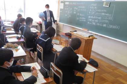 1年・授業風景 公開日 2023/04/27 更新日 2023/04/27 1学年 4月27日(木) 2限 ようやく過ごしやすい天気になってきました。 (連日、ヒンヤリというか肌寒いくらいの体感だったので……) 授業に集中して取り組んでいます。 (写真 上:1年1組 国語「シンシュン」) (写真 中:1年2組 社会「世界の姿」) (写真 下:1年3組 社会「世界の姿」)