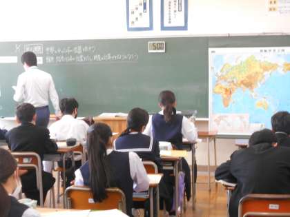 (写真 上:1年1組 社会「世界の中の日本の位置」)