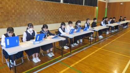 生徒総会・その1 公開日 2023/05/02 更新日 2023/05/02 生徒会活動 5月2日(火) 5,6限 前期生徒総会を第1体育館で行いました。 (実際に体育館に集まって生徒総会を行ったのは4年ぶりです。) (写真 中:左から専門委員長、議長団、執行部、学年代表) (写真 下:活動計画を発表する執行部) 少し緊張感が漂っていました。