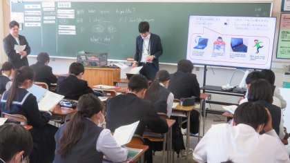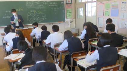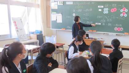 (写真 中:2年2組 理科「化学変化を化学式で表す」)