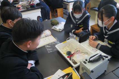 3年1組の理科は、第3理科室で、「酸性、アルカリ性の水溶液の性質」を調べる実験を行いました。