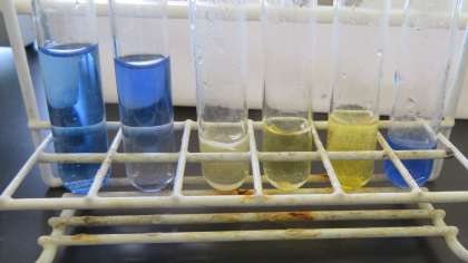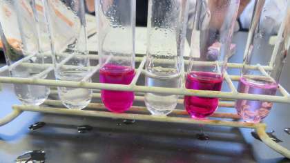 うすい塩酸、うすい硫酸、うすい水酸化ナトリウム水溶液、アンモニア水、石灰水、酢酸の水溶液の性質を調べました。(写真:上)