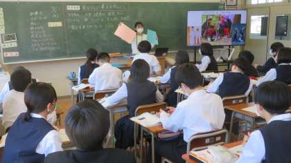 (写真 下:2年5組 家庭科「自分らしい着方をしよう」)