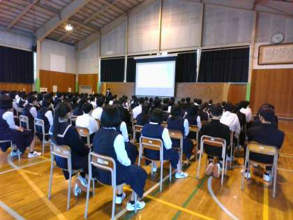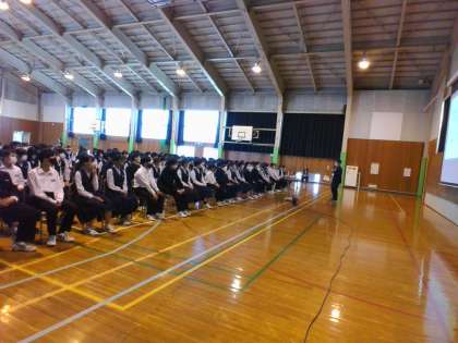 2年生は学年集会で、「社会に学ぶ『14歳の挑戦』」のオリエンテーションを行い、生徒は真剣に話を聞いていました。