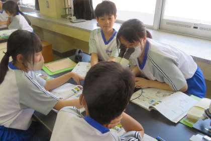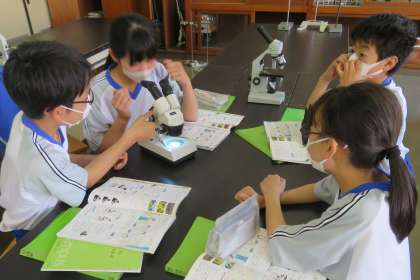 1年3組の理科は、第1理科室で、双眼実体顕微鏡の使い方を学習していました。