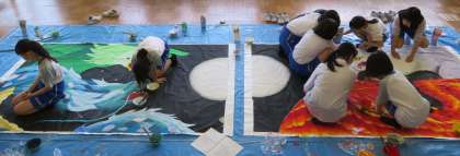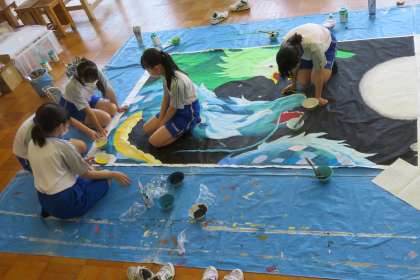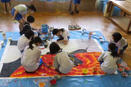 技術室では、体育大会に向けて、美術部がデコレーションを制作しています。(写真)