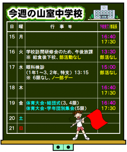 明後日16日(火)は学校訪問研修会のため、給食後、午後放課(部活動なし)になります。