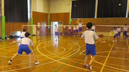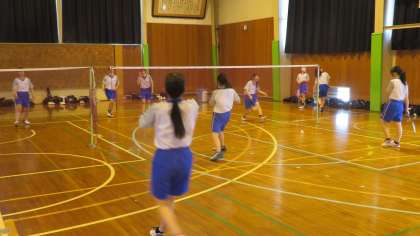 第1体育館の半面で、男女バドミントン部が活動しています。
