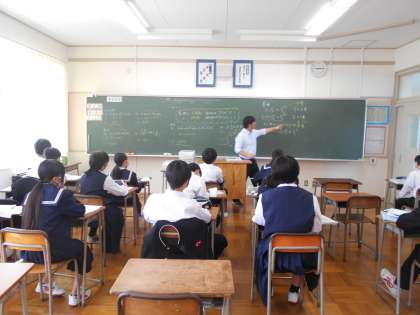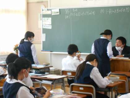 (写真 中・下:1年2組 数学「正負の数のかけ算」)
