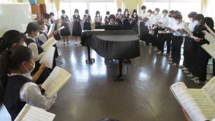 2年・音楽・「翼をください」 公開日 2023/05/18 更新日 2023/05/18 2学年 5月18日(木) 5限 2年1組の音楽は、音楽室で、「翼をください」を練習していました。 音楽室もエアコンがあるので、学習環境は快適です!