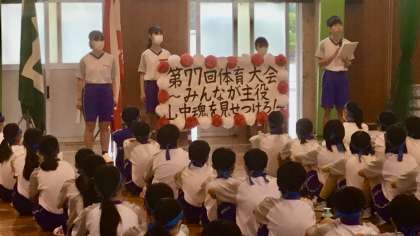 体育大会・結団式・その1 公開日 2023/05/19 更新日 2023/05/19 山室中学校のページ 5月19日(金) 3限 体育大会・結団式を第1体育館で行いました。 (写真 上:実行委員長の挨拶 下:スローガンの紹介) 今年度のスローガンは 「みんなが主役 〜山中魂を見せつけろ〜」 です。 山中生全員で一丸となり、山中魂を体現していきましょう!