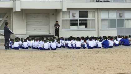全校生徒がグラウンドに集まり、学年朝礼を行いました。