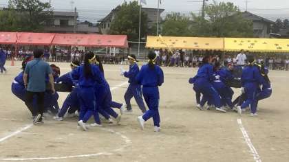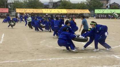 3年女子団体種目は騎馬戦タイヤ引きです。
