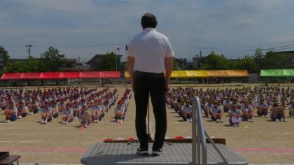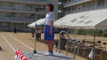 第77回 体育大会・その24 公開日 2023/05/28 更新日 2023/05/28 山室中学校のページ 5月27日(土) 13:30 閉会式での (写真:上 校長先生の閉会の言葉) (写真:中 富崎実行委員長の言葉) (写真:下 団長が指揮した校歌斉唱) 国旗が降納され、第77回 体育大会が終わりました。