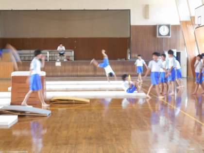 第2体育館では、マットや跳び箱の練習を粘り強く行っています。