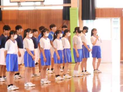 壮行会・その2 公開日 2023/06/14 更新日 2023/06/14 山室中学校のページ 6月14日(水) 6限 大会会場の説明の後、各部長が意気込みを述べました。 (写真 上:野球部) (写真 中:女子ソフトテニス部 下:男子ソフトテニス部)