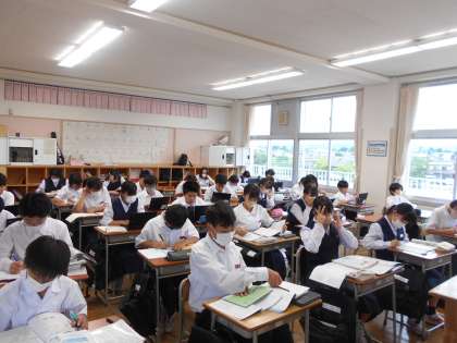 1年・定期考査に向けて 公開日 2023/06/16 更新日 2023/06/16 1学年 6月16日(金) 9:40 市総合選手権大会に参加せず、登校している生徒たちは、定期考査に向けて、各々で学習を進めています。 1年生は、3つの教室に分かれて、黙々と課題に取り組んでいます。
