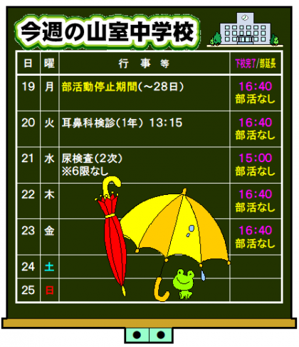 ♪今週の山室中学校♪ 公開日 2023/06/18 更新日 2023/06/18 お知らせ 6月18日(日) 23:00 明日から、「第1回 定期考査」に向けての部活動停止期間に入ります。 放課後の時間を有効に活用し、テスト勉強を進めましょう!
