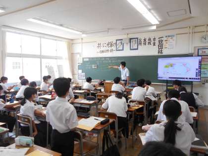 (写真 上:1年1組 社会